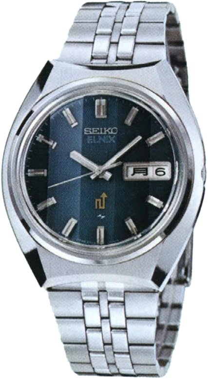 This is a Seiko Elnix 0703 from the early 1970s, featuring Seiko's innovative tuning fork movement technology that competed with Swiss electronic watches of the era. The watch displays the characteristic cushion case design and features a day-date complication, representing an important transitional period in Seiko's horological development.